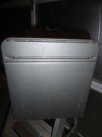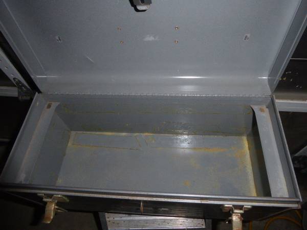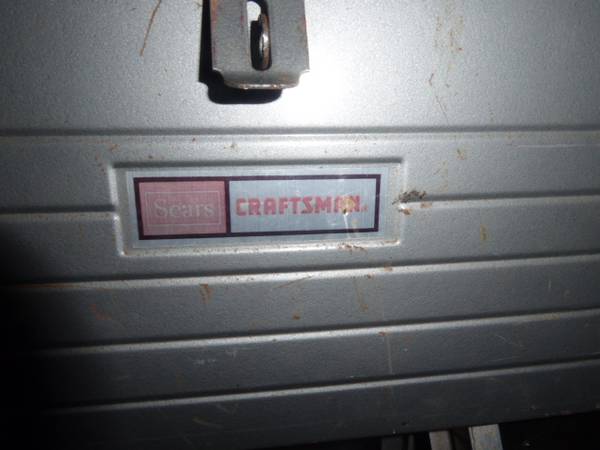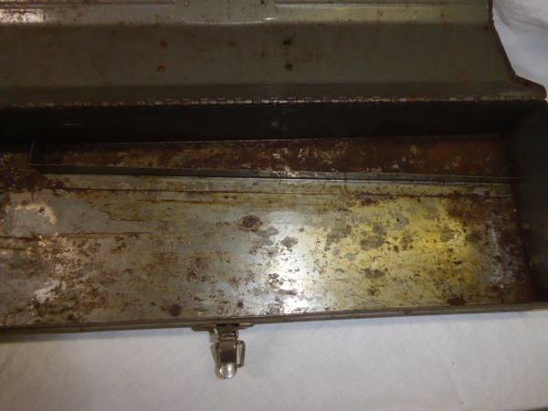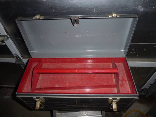 2. Sears Craftsman Gray Tool Box. 20" long, 8 1/2" wide, 8 1/2" tall. 3 latches with the center one made for padlock. Red metal tool tray. Black plastic handle. Surface rust on lid. $25.