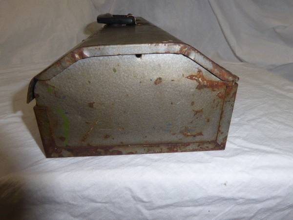 1. Vintage Craftsman Hip Roof Tool Box. 19 1/2" long, 6" wide, 3 /58" tall. Single center latch. Plastic handle. Single continuous hinge. Inside on the bottom is a metal rail to hold sockets. Gray in color with paint loss and rust. $25.