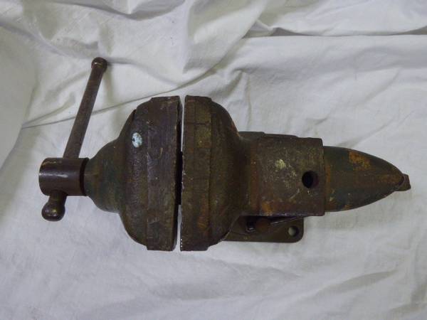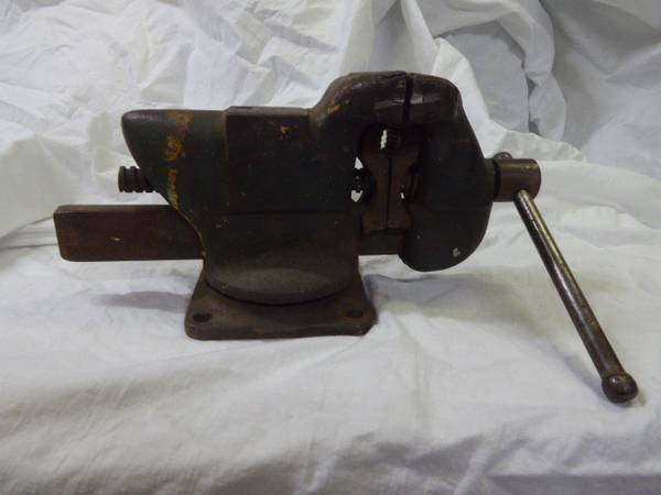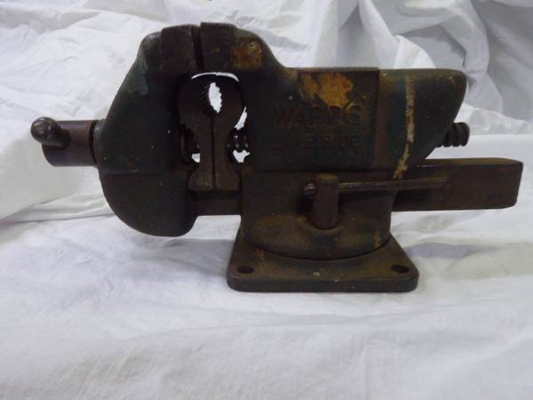 This is a Wards Lake Side Anvil & Hardy Hole Swivel Vise. Green in color. 3 1/2" jaws. 5 1/2" tall, 11 1/2" long. All works. $75. It is in Penryn. Call to see it/buy it.