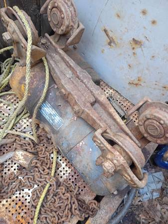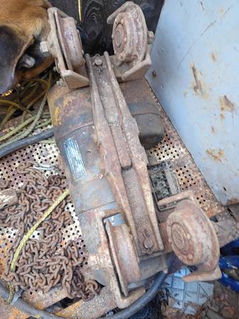 I've got this chain hoist. Came from the back of Dad's shop. It's been sitting in a corner for as long as I can remember. Anyways. It looks like 220 volts. Missing a plug but other than that everything seems to be there. I don't know if it runs or not. That's why it's 50 bucks. I figured the rollers were worth that anyways. Phone call or text works best for getting a hold of me. Thanks for looking