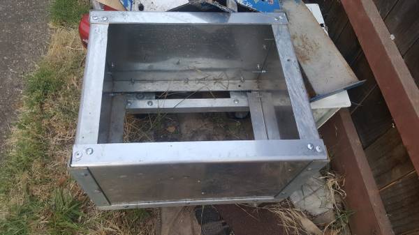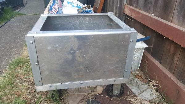 Call Text Silver Aluminum Box on 4 wheels $80 key words Tool box Wagon trailer camp yard work storage garage lid cover wheel pulking cart