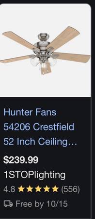 I currently have two brand new still in the box which has never been opened ceiling fans, hunter ceiling fan to be more specific 52 inches indoor model number 54206 if you want to buy this right now from the store, you’re going to pay over $250 at the minimum guaranteed I have two of them here $100 each brand new if you buy both $170 you can’t beat that really first come first serve call or text me anytime show contact info