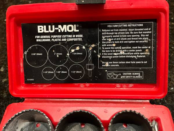 We are selling a BLU-MOL HOLE SAW KIT COMPLETE. This kit is complete with all pieces and is in great condition. If you are interested please respond to this ad or you can text me. Thank you.