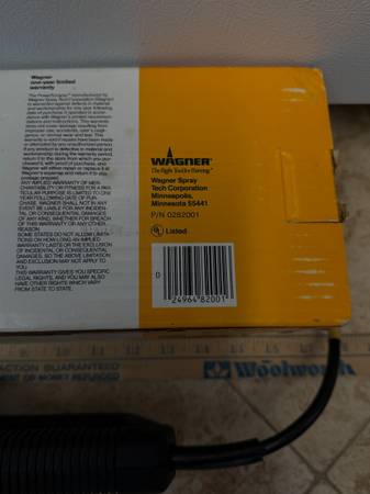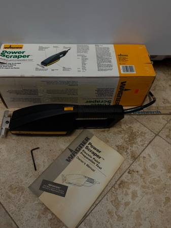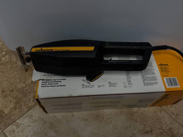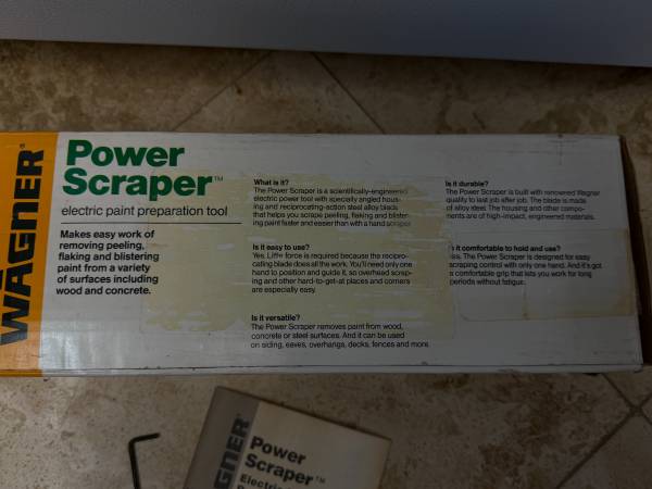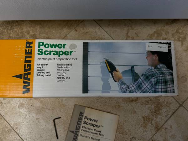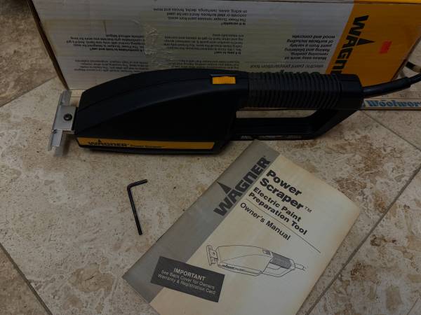 Includes original box, instructions and wrench. The Wagner Power Scraper 0282001 is a corded electric paint tool that boasts a sturdy steel blade and a durable plastic and metal construction. This power scraper is designed for efficient and effective paint stripping and putty application. Measuring 13 inches in length and 3 inches in width, it is a versatile tool for various home and garden projects.