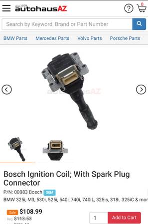BMW E36 M3 S50 Ignition Coil OEM Bosch 0221504410 ,12131748394, 00083 brand new. 325i, M3, 530i, 525i, 540i, 740i, 740iL, 325is, 318i, 325iC & more