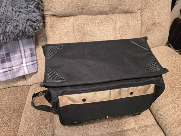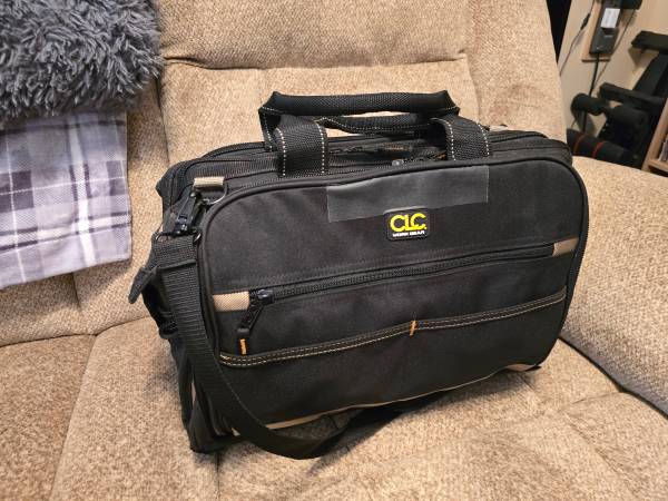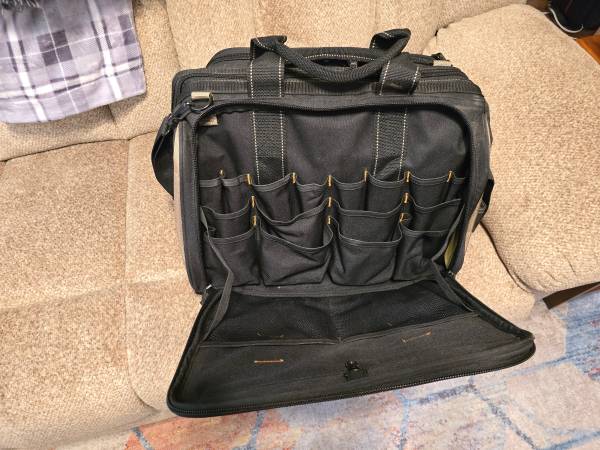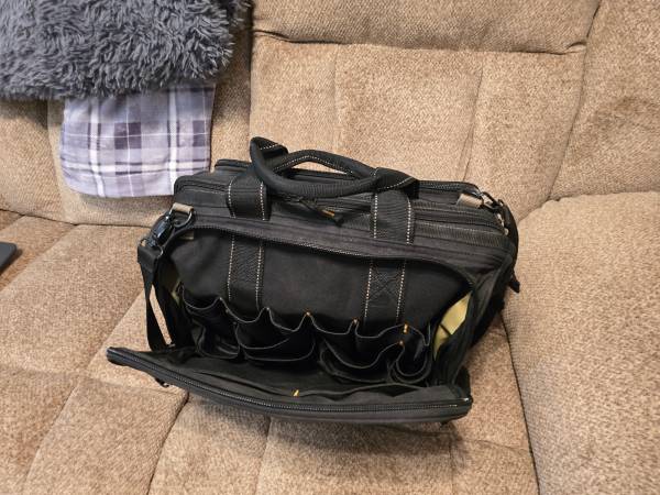 Selling this barely-used tool bag. Bought it for a job I never ended up working. Virtually zero wear-and-tear. Just look at the rubber feet. Has my last name in silver sharpie underneath the strips of black gaff tape near the handles. Easy enough to cover or write over.