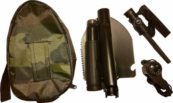 BUNDLE INCLUDES - Shovel / Pick Combo with Saw & Bottle Opener, Magnesium Fire Starter Rod & strike (mini saw) with whistle & compass. Also 3-in-1 whistle with neck strap, compass, and thermometer. Ideal to alert help or summon people to the camp fire.