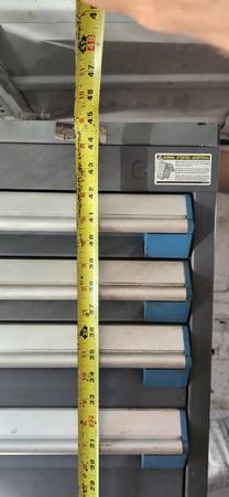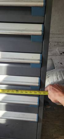 The link represents the closest match I could find. This one does not have a key or locking feature. It was mounted inside a van. The forklift able frame has been modified to sit flat on the frame. The top has a rim. All drawers open smoothly and lock into the closed position.
