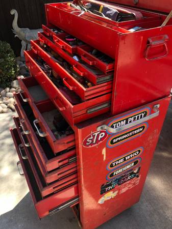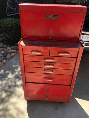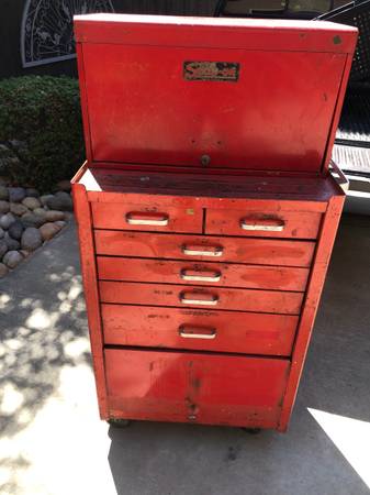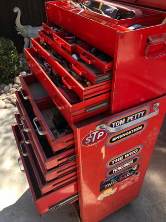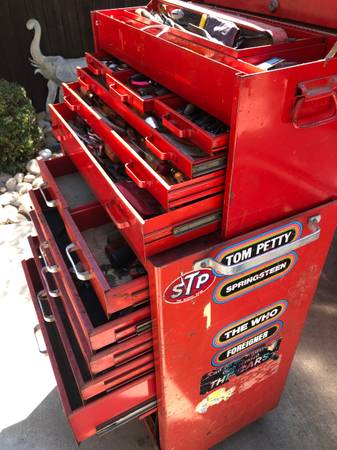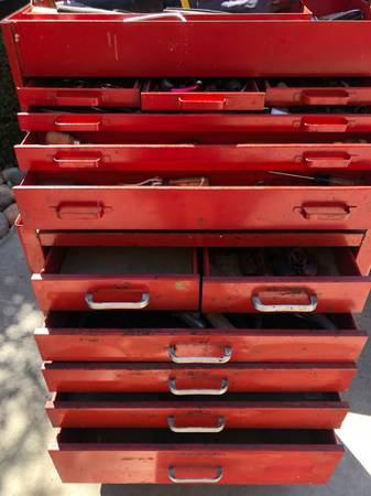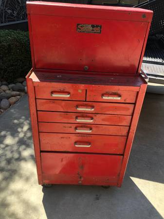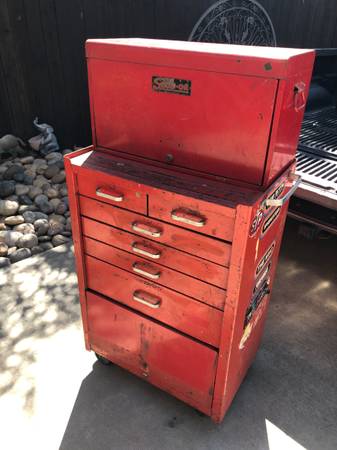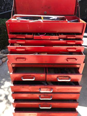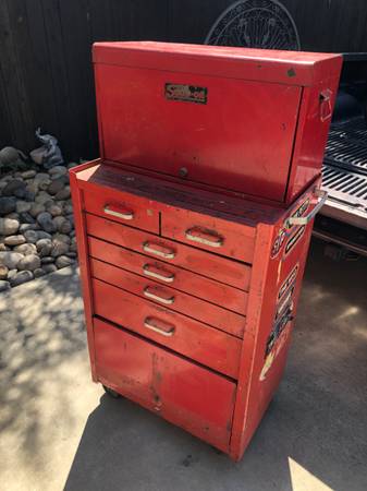 Snap On 2 Piece Rollaway Toolbox with lots of Misc Tools. On wheels $380 Cash Only for ALL. Top is 26"w.12"d. 14 1/2"h. Bottom is 26 1/2"w. 18"d. 40 1/2"h. Located in Vacaville Call or Text