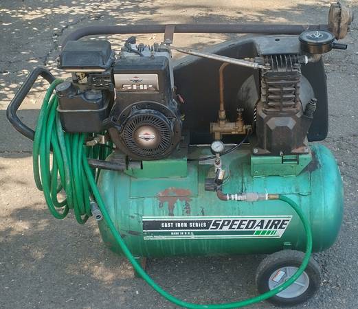 Speedaire 9X750 Air Compressor -20 Gallon Tank -5 HP Gas Engine -110 Max PSI -50', 3/8" Hose/Fittings Works good, used to blow out radiators, air filters and to run a 1/2" Impact Gun & Grinder...