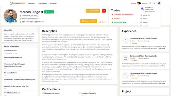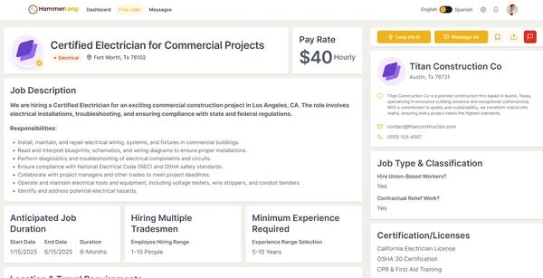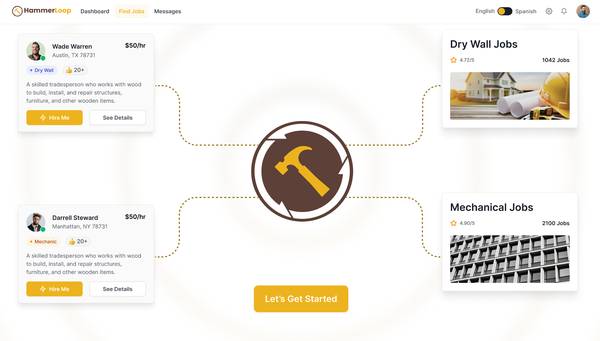 Go to the new bilingual platform built for workers, www.hammerloop.com, and create a free profile that showcases your skills, and lets these hirers find you in one spot, and they can search for you by trade. Also, when they post jobs on hammerloop, you get alerted of the jobs and can see multiple jobs at once with pay rates, location, who is hiring, and more! If you like a job, you hit the 'loop me in' button, and the employer can see your profile and send you a message.