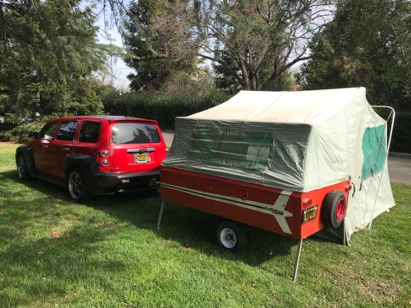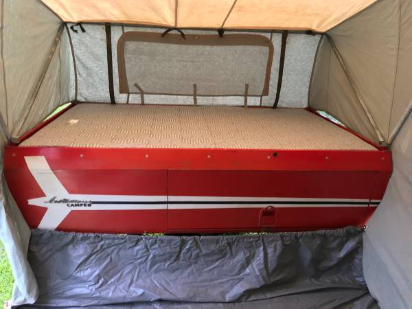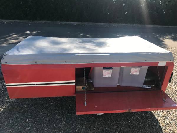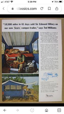Rare 1962 Ted Williams tent trailer, excellent original condition, purchased from original owner family, double bed, room for several other people in the tent, inside/ outside storage, inside storage opens up for table top, good fitting storage containers are inside the trailer, only 400 lbs, can be pulled by any car, ready to camp this weekend, will include Coleman lantern, stove & heater. This trailer could be in a museum.
