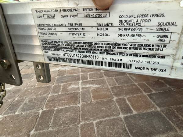 Selling my 2024 Triton 1481 tandem axle trailer. Fits 2 or 4 seater UTV. This trailer is designed for heavy-duty use and comes with electric brakes to support its carrying capacity.