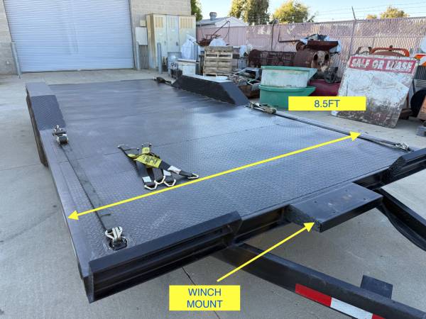 Deck size 8.5 wide with ride over fenders, 18ft 3inch in length.