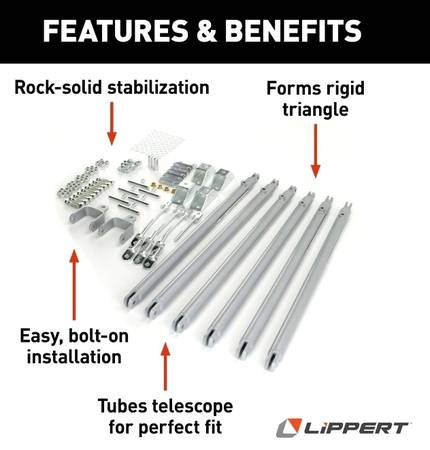 FOR A SOLID CAMPING EXPERIENCE THE KIT ATTACHES TO YOUR RIGS LANDING GEAR AND FRAME TO FORM A SOLID TRUSS ELIMINATING ANY INSTABILITY.