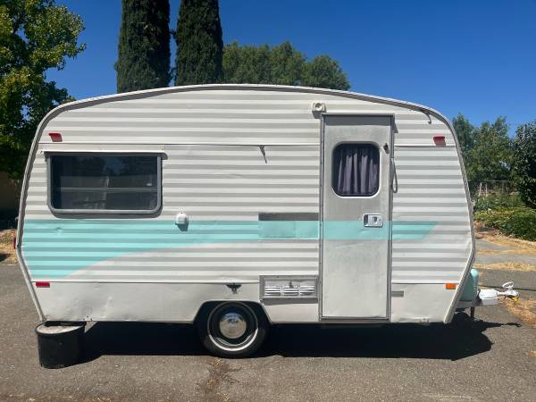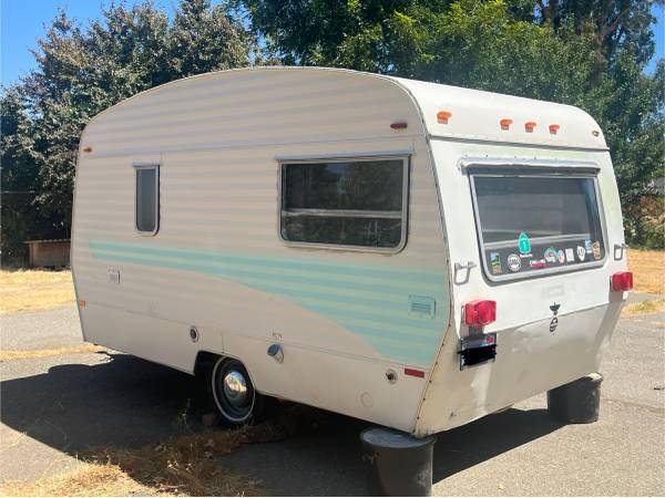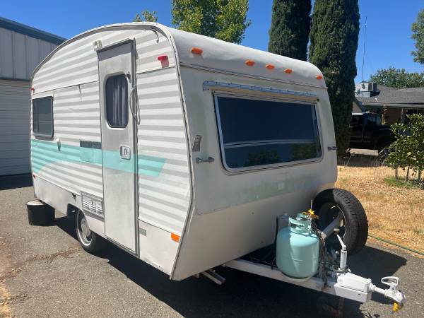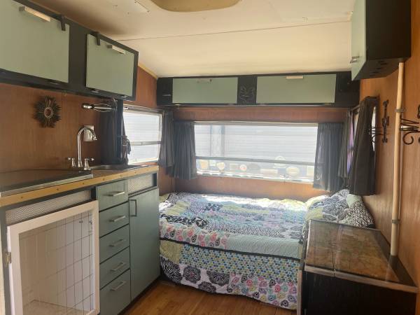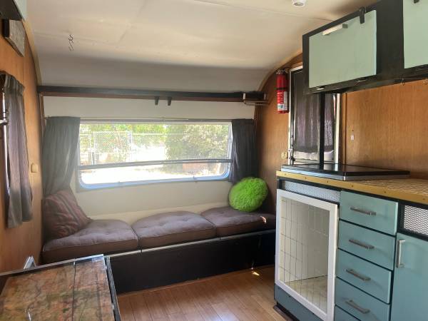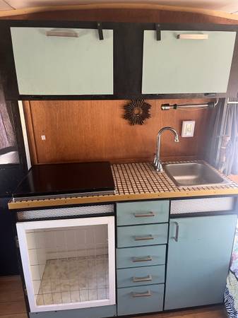 Very cute vintage “canned ham” camper trailer. Includes propane range, sink and grey water tank. It does not have a refridgerator but has space and hook-up for a small propane fridge.