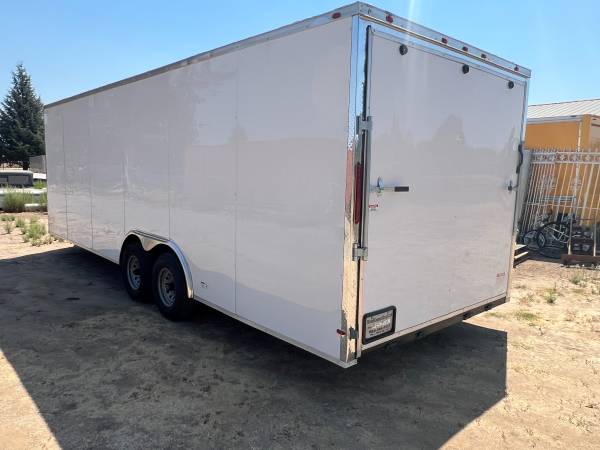 For sale by a private seller, new 24ft enclosed trailer for purchase. The trailer is equipped with an extended tongue, upgraded 5200LBS axles, brakes on all four wheels, upgraded pollycore sides, LED lights, 7ft interior, spare tire, interior light, 3/4 inch flooring with D-Ring tie-downs, and a GVWR of 9990LBS. The trailer weighs 3600 LBS and requires a 2 5/16 ball. Please note that the price is firm, and no offers will be accepted.