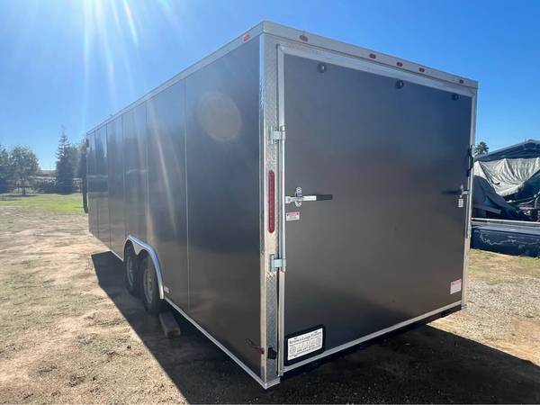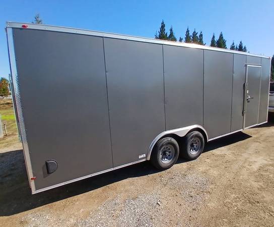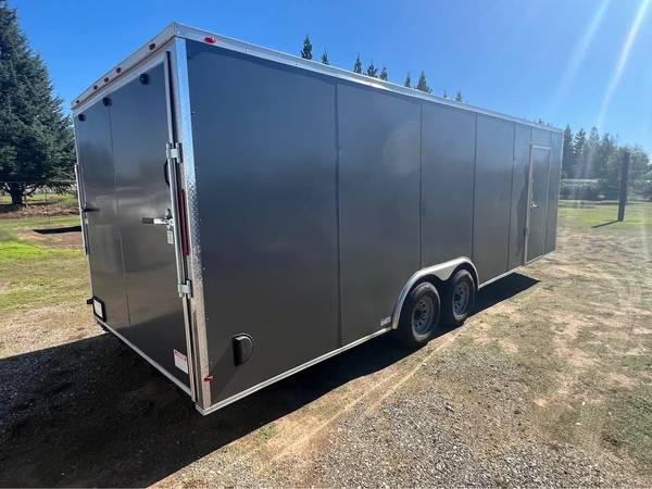 For sale by a private seller, new 24ft enclosed trailer for purchase. The trailer is equipped with an extended tongue, upgraded 5200LBS axles, brakes on all four wheels, upgraded pollycore sides, LED lights, 7ft interior, spare tire, interior light, 3/4 inch flooring with D-Ring tie-downs, and a GVWR of 9990LBS. The trailer weighs 3600 LBS and requires a 2 5/16 ball. Please note that the price is firm, and no offers will be accepted.