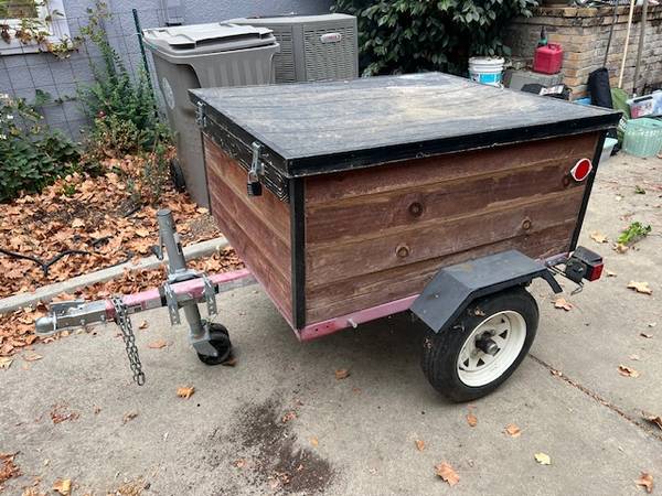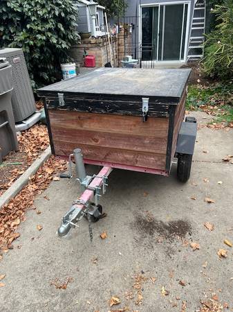 Small utility trailer built with a wood box and hinged top. Approximate box size is four feet wide, five feet long, and two feet deep. The lid has metal hinges and latches that you can secure with a padlock. A spare tire is mounted on the rear. Coupler fits a two inch ball and includes safety chains. Tires hold air and lights are installed. Wood panels show wear and there are water stains inside, but the trailer still pulls fine. Good for hauling camping gear, tools, or yard waste. I have a California permanent trailer plate and the title in my name. Cash, Venmo, or Zelle accepted. Located in Sacramento, ZIP 95818.