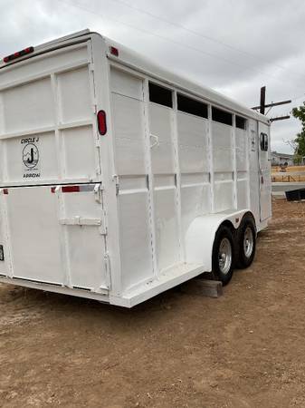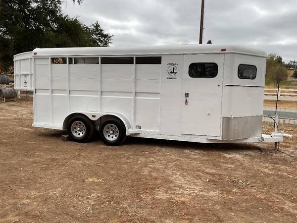 This Circle J 3 horse slant horse trailer is 15 feet long. It has fresh, new paint, new tires, a good floor with good rubber mats, a tack room with 3 saddle rack, and is DMV registered. $9,600...