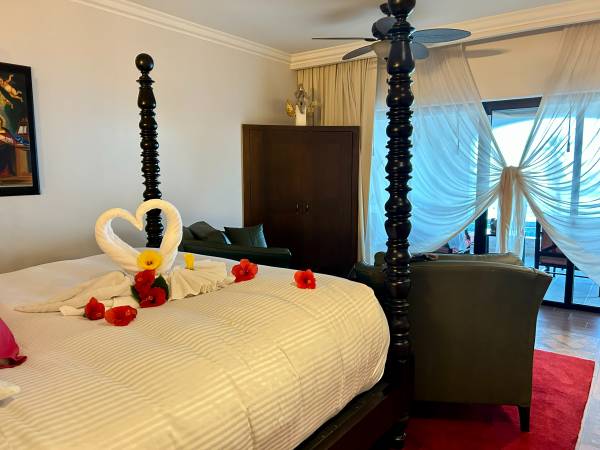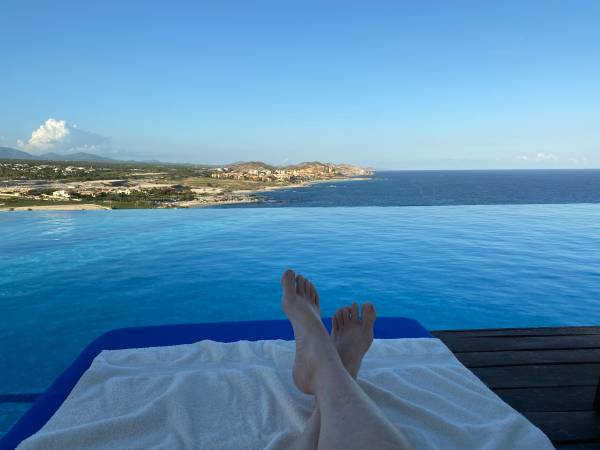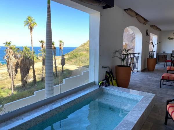 Available December 27, 2025-January 3, 2026. Stay in luxury at Vista Encantada Spa Resort in Cabo San Lucas in this 2-bedroom ocean view villa; sleeps 6. This delightful property features 1 king bed, 2 queen beds, 2.5 bathrooms with double showers and bathtub, full kitchen, and a cozy living room with a sofa bed. The spacious balcony offers a gorgeous view of the Sea of Cortez with private plunge pool, BBQ grill and plenty of furniture for lounging and outdoor dining. Guests will enjoy amenities like AC, Wi-Fi, in-room laundry, onsite fitness room, full-service spa, and rooftop infinity pool/hot tubs/bar with casual dining. The spa resort is located on the Hacienda Encantada resort property with multiple pools, hot tubs, swim-up bars, onsite restaurants and amazing views all available for your enjoyment. There is a free property shuttle available to help you get around. Multiple onsite activities for adults and children are available (many are free), such as fitness classes, tennis courts, pickle ball, putting green, children's water play area, and horseback riding. Nearby activities include beautiful local beaches, snorkeling, SCUBA diving, deep-sea fishing, whale watching (winter/spring), ATV rentals, bird watching, golf, sunset cruises, exploring the colonial buildings and art galleries of San Jose del Cabo, or taking a day trip to Todos Santos (one hour drive) or Cabo Pulmo National Marine Park (2 hour drive). This charming villa offers privacy and tranquility just outside the excitement of Cabo San Lucas. Optional all-inclusive packages are available through the Vista Encantada resort. A mandatory daily service charge of 12.00 USD will be added to your bill at check-out (amount accurate as of November 2024).