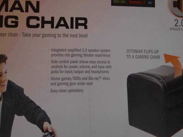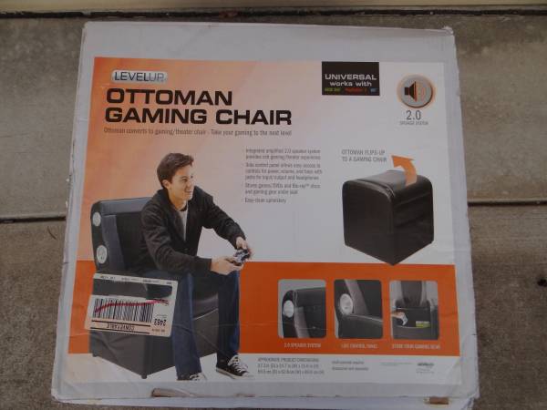 Up for grabs are these NEW Levelup Black/Gray Upholstery Ottoman Gaming/Theater Chair. New and still in the box. Measures out at approximate 27 inches Deep X 24 inches wide X 35 inches height. Features 2.0 speakers system, side control panel, seat lifts up for storage and the back rest lowers to make the chair into an ottoman. There is a Youtube video on this item. Has the black and gray upholstery on the seat and seat back. The rest is wrapped in a black slick vinyl material. Priced out at $60.00. I can be contacted via phone or text. Thanks for looking at my ad and have a great day. Cheers, Carter