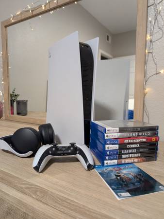 Selling my Ps5 console with headphones, 8 games, controller, all the cords. Condition is like new works perfectly without any issues. I don't have time to play anymore so I need to sell. Please contact me at show contact info