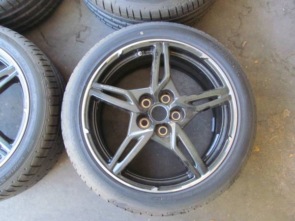 Set of 4 matching same sized 19" diameter by 8.5" wide late model front Corvette Carbon Flash Metallic takeoff wheels with new 245/45R19 Hankook Ventis S1 evo2 Run Flat tires, never on the ground. Wheels were bought in 2021 with the intent on fitting to a 2005 Cadillac XLR that uses a 4.75" aka 120.65mm bolt pattern. Found out after that these wheels have a metric pattern of 120mm, and have a smaller hub bore hole. So mounted and balanced to find out that these were the wrong wheels for the intended application. Corvettes have staggered sizes, so not appropriate to use on a Corvette. The whole set with new TPMS sensors for $1,400, or just the wheels with sensors for $900. Should fit late model Cadillac cars, Camaros, and other GM products that use a 120mm bolt pattern.
