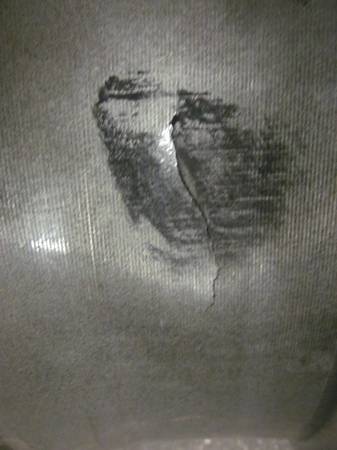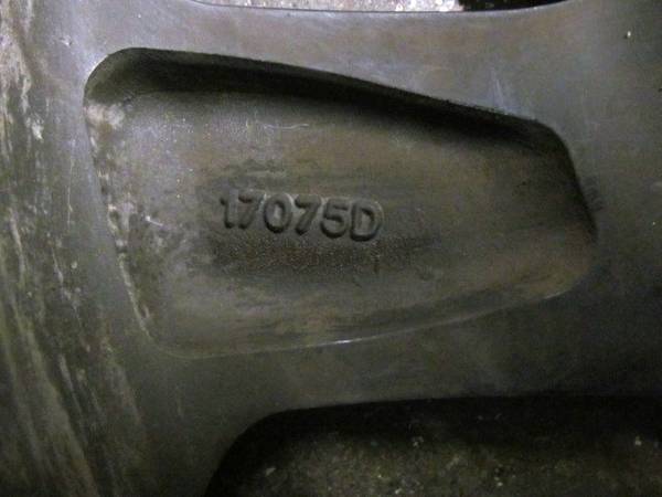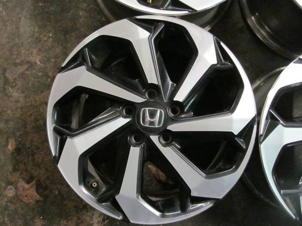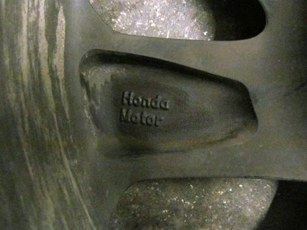 One cracked in the center section Honda Accord EXL 17 inch Gloss Black and machined finished OEM wheels, 17" diameter by 7.5" wide, 5 lug pattern, still like new facing. Honda part number 42700-T2A-L74, with a Mr. Honda list price of $554 each. Buy it for $10, if you think that it might repair, or for an art project.