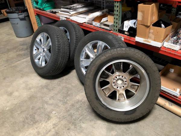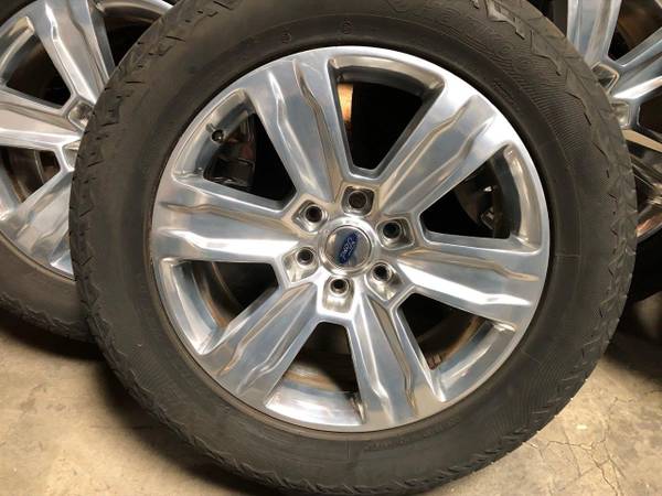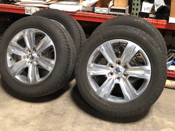 Took these off my 2019 F150 Platinum truck for different larger rims. They are in excellent condition with no damage at all. Polish is excellent. Comes with all factory lugs, 6 per wheel. These are great looking factory wheels. Tires are the originals from Ford and on the lower end of ware. You may get a year or more out of the tires. Nice upgrade for your truck that came with the smaller wheels.