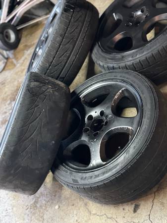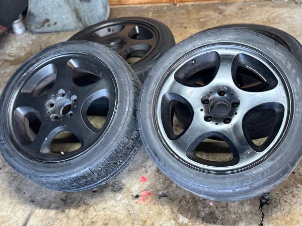 I have 7 Mercedes rims for sale. I cracked one years ago and replaced the whole set. That is why there are only 7 wheels. The tires are not good on a few. Staggered. Black . 400 takes them all.