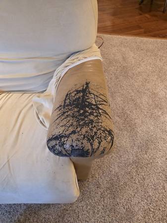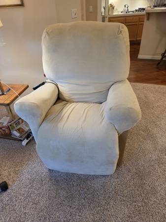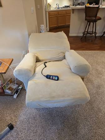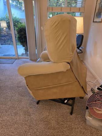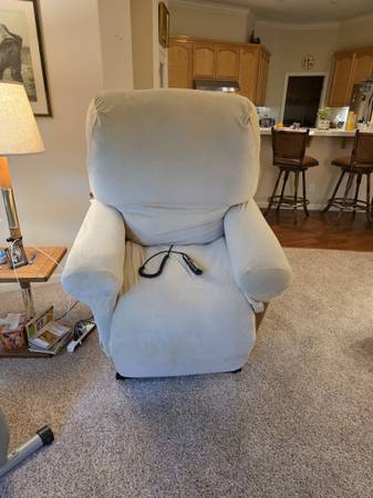 Large lift chair. Works good but vinyl is pealing. Has a slip cover. Moving and needs to go