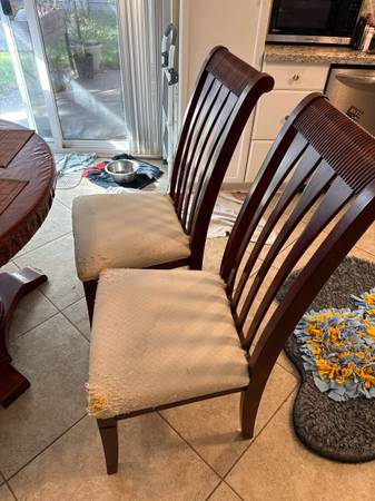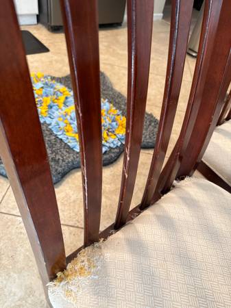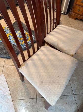 Chair structures are in good shape but the upholstery has damage from cats. Wood can also use touch up paint. These could be revived with new upholstery or good covers. We have covers but they are not in great shape either.